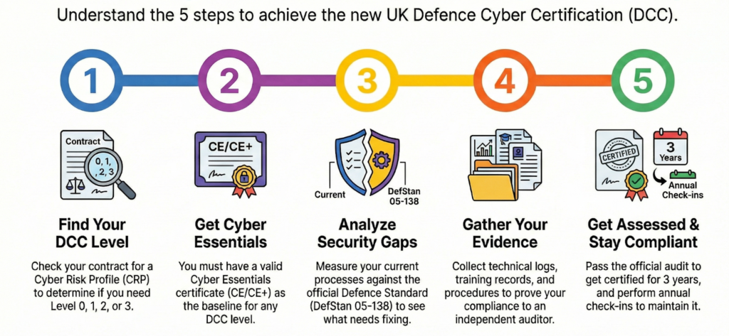 After a successful assessment, you will be granted a DCC certificate valid for three years. However, the MOD now expects continuous compliance rather than a set and forget approach. You are contractually required to perform an annual check-in (or attestation) on the anniversary of your contract award to confirm you still meet the standards. Furthermore, you must maintain a valid Cyber Essentials or CE+ certificate throughout the duration of your DCC certification. This ongoing cycle ensures your organisation remains resilient against evolving digital threats while fulfilling its obligations under DEFCON 658.